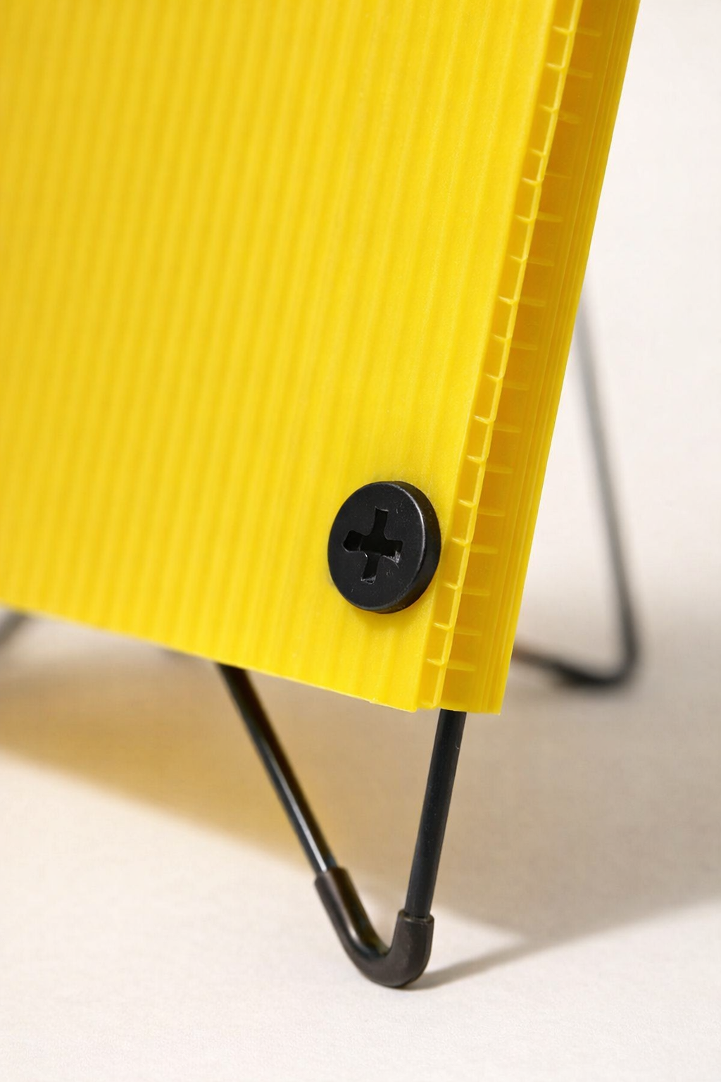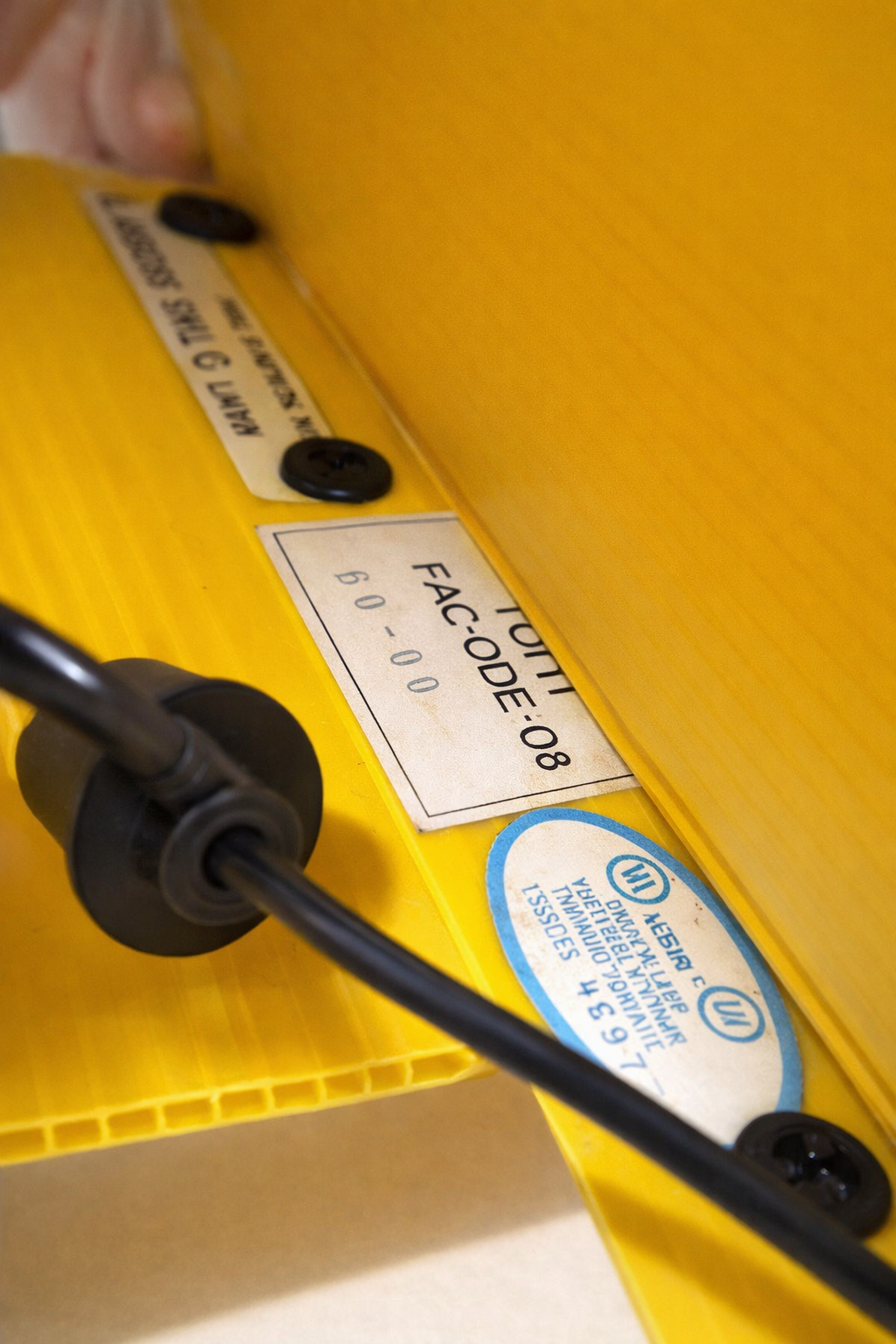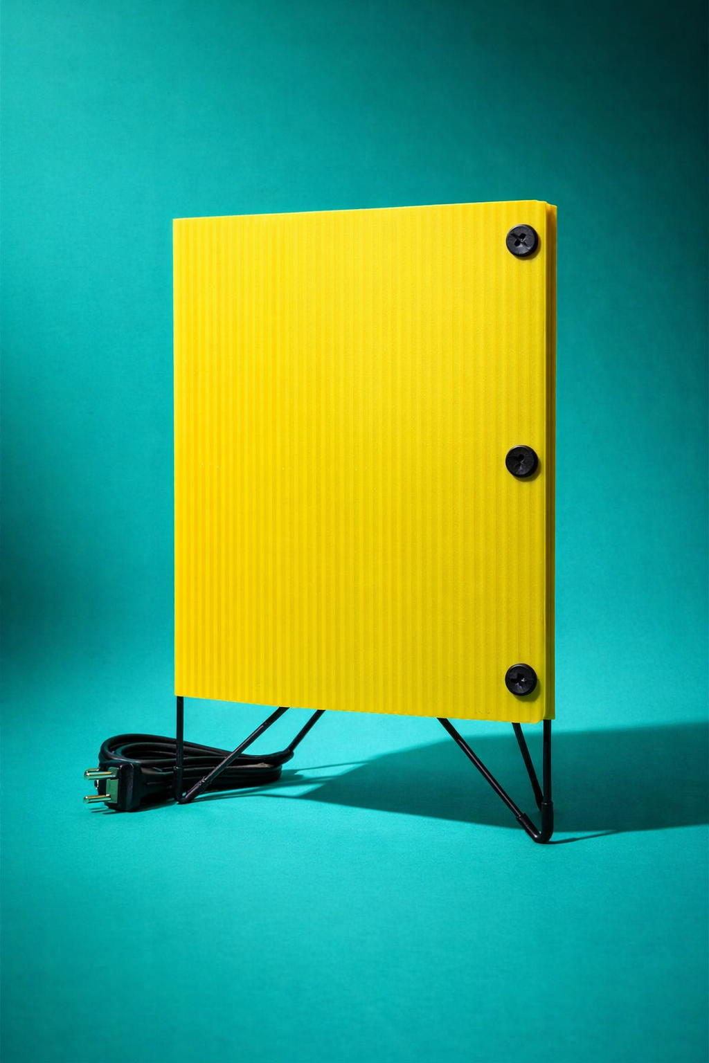 Italian industrial design, circa 1970s — a wall or floor lamp encased in a deeply ribbed ABS thermoplastic shell in a yellow that reads less as color than as signal. The ribbing is structural and aesthetic simultaneously: it stiffens a thin-gauge material while creating a surface that catches light in vertical bands, turning the lamp into its own argument. Two black Phillips-head screws hold the casing with a frankness that belongs to the same moment as Ettore Sottsass's factory objects and Joe Colombo's utility furniture — the hardware is not hidden, it is part of the composition. Against a white wall, it reads like a postcard from Italian optimism.