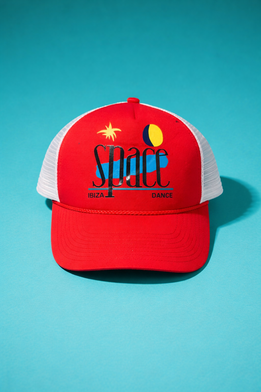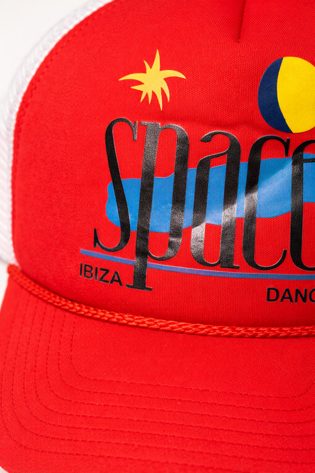 Red cotton front panel with white mesh back — the classic trucker construction that survived because it worked. Space branding from the Ibiza club era when electronic music culture was still building its mythology, one logo at a time. The graphics layer sun, sea, and sound into a single emblem.
