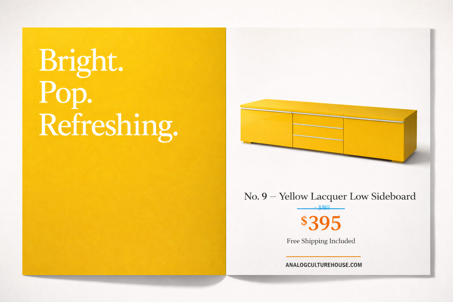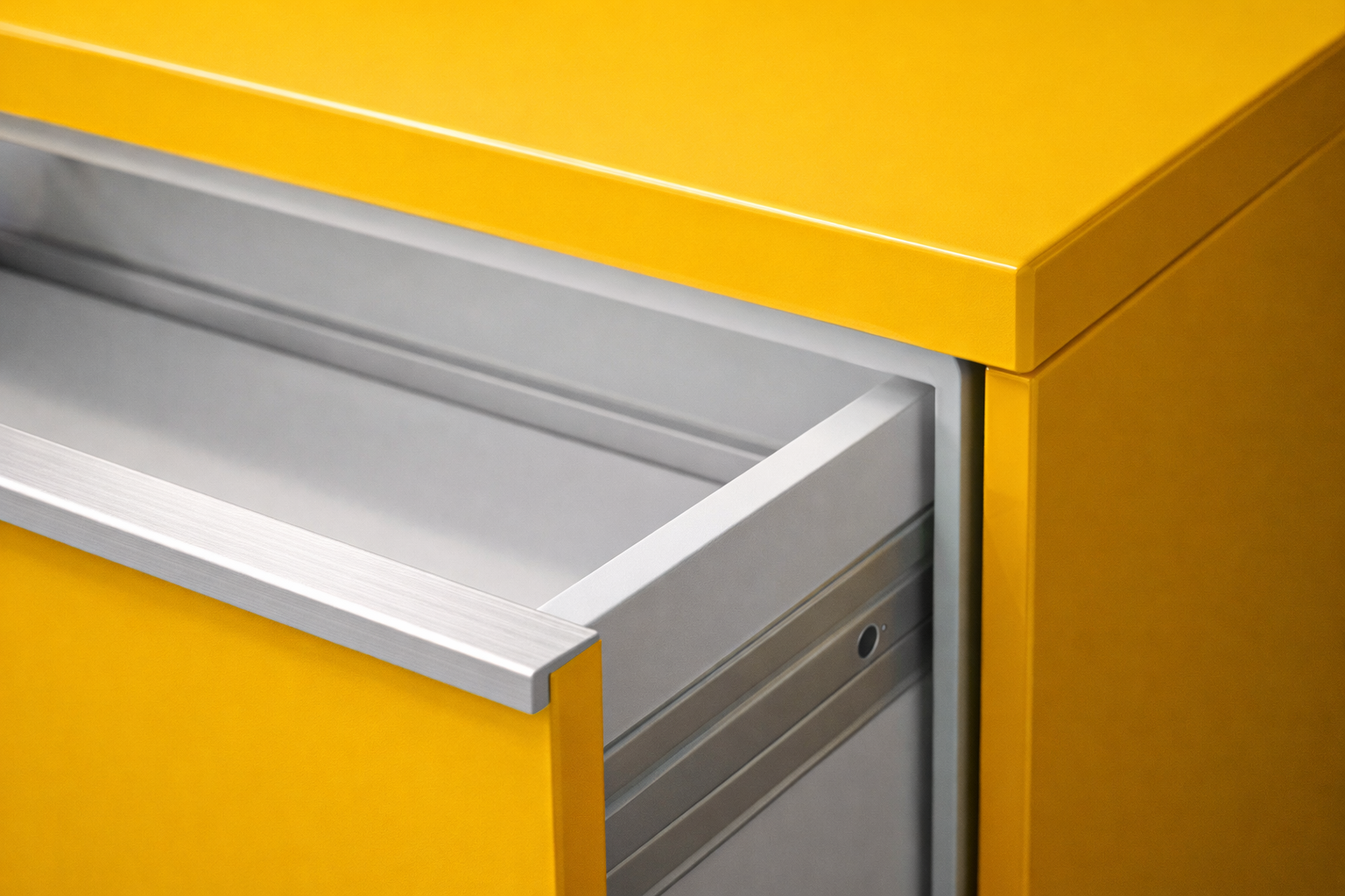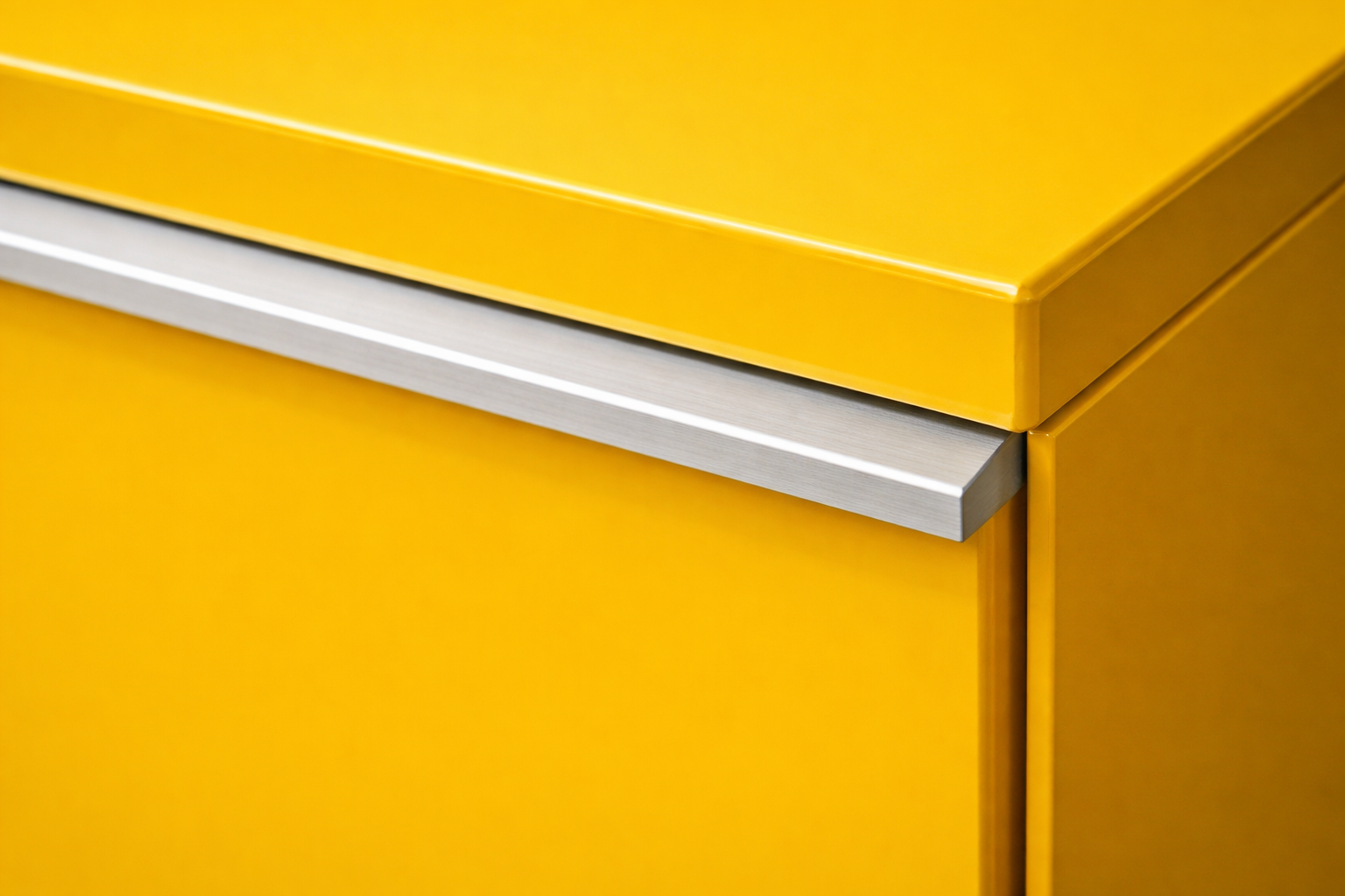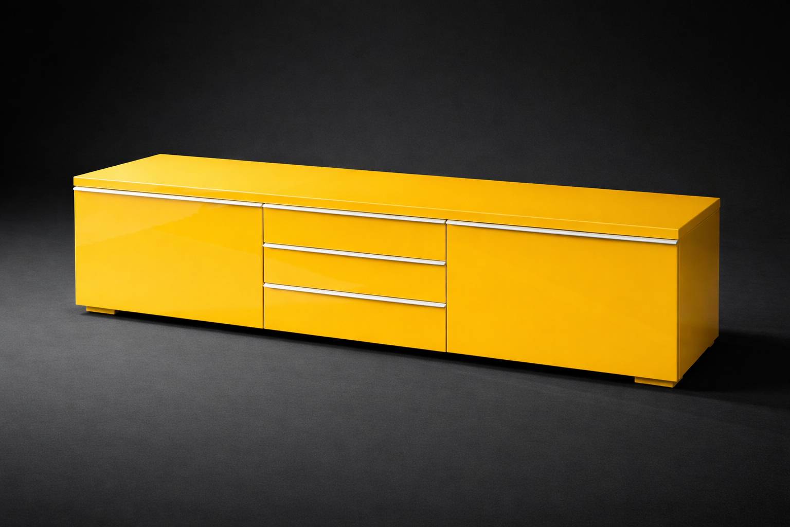 A bold yellow lacquered cabinet with clean modernist lines. The color is a true statement — not a trend piece, a commitment.